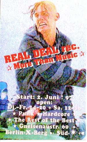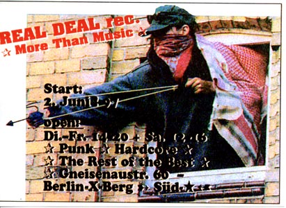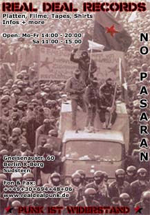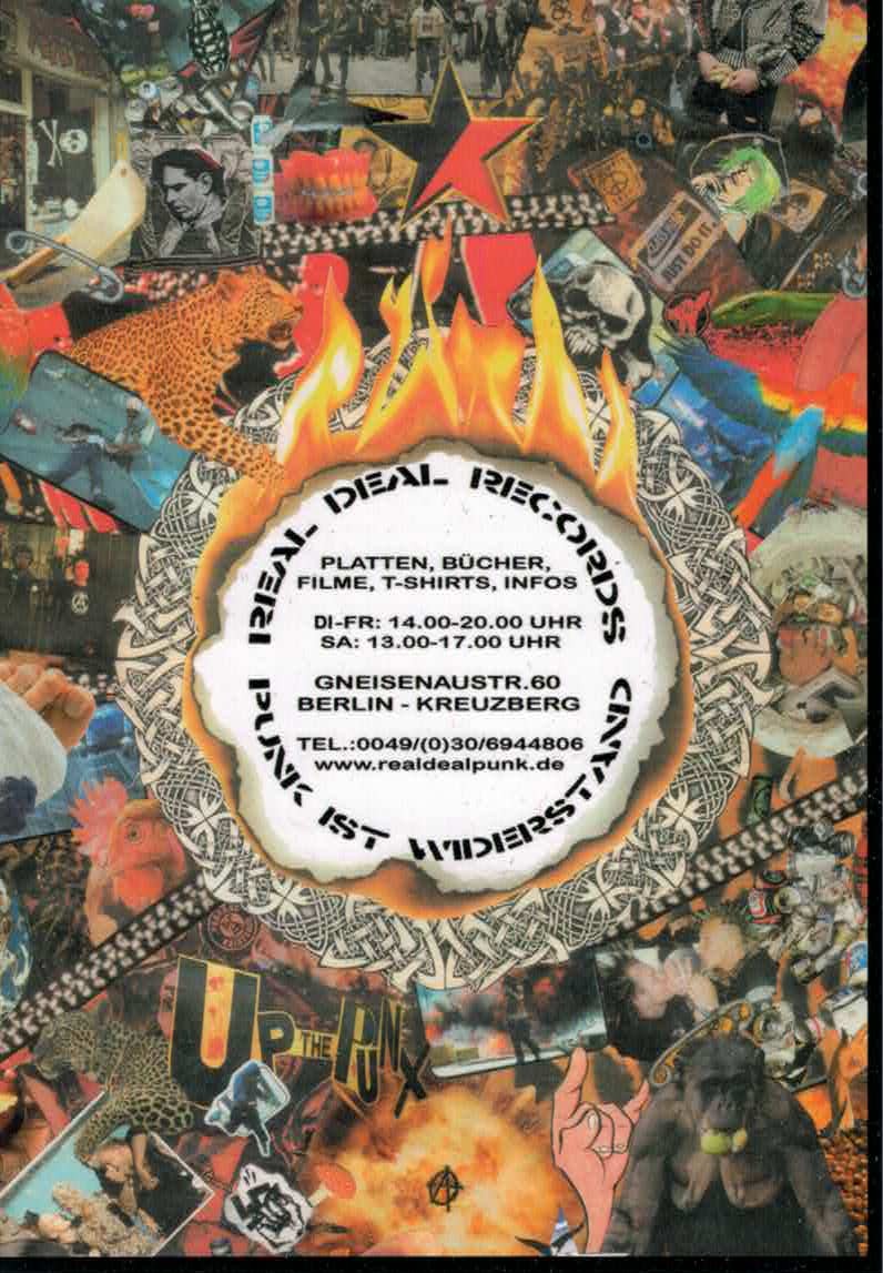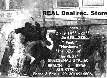 reduzieren, ganz bewußt haben wir auch andere korrekte Sachen im Laden. Wir versuchen immer auch Informationen bieten zu können, was z.Zt. politisch so läuft ; das Antifa-Info, Interim, Profane Existence, aktuelle Flugblätter, Flyer, Plakate bekommt mensch bei uns eigentlich immer. Rechtsoffener, patriotischer, sexistischer oder sonstiger Müll sollte bei uns nicht zu finden sein, aber da wir nicht immer alles wissen, sind wir auch auf eure Infos angewiesen. Naja, Müll wie Böhse Onkelz, Rammstein, Backfire, Type O Negative, Reducers SF oder Earth Crisis gibt es bei uns auf jeden Fall nicht und wird es auch nie geben, egal wie die finanzielle Lage aussieht. Wir legen besonders großen Wert darauf, unser Zeug zu korrekten Preisen anzubieten, wobei wir eben auch in einer kapitalistisch geprägten Umwelt überleben müssen, und so Sachen wie Steuern oder Miete nun mal ziemlich reinhauen. Also bevor gemeckert wird, erstmal nachfragen, warum bestimmte LP`s, CD`s oder Tapes so viel kosten, an uns liegt es normalerweise nicht. Wir verdienen uns mit dem Laden bestimmt nicht dumm und dämlich (ganz im Gegenteil, das läuft hier mehr oder weniger ehrenamtlich..: